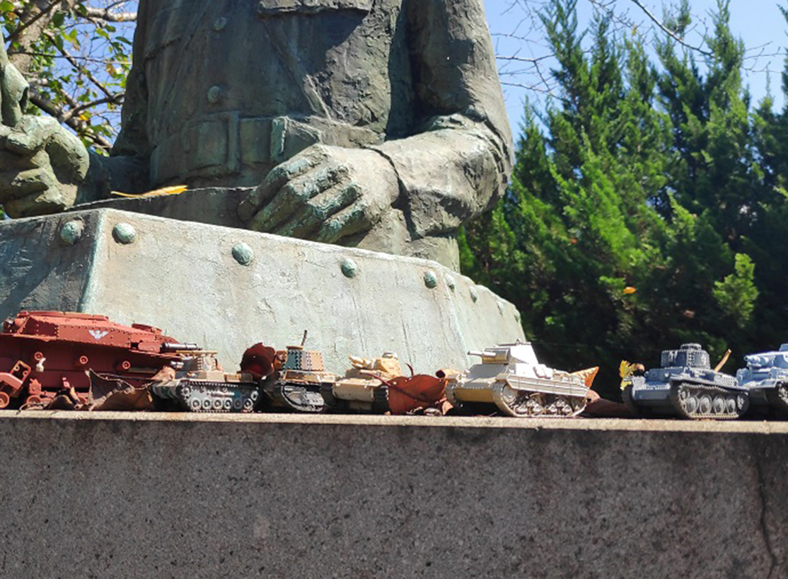 西住公園は、いつからかガルパンの聖地として訪れるファンが増え、顕彰像にはミニチュアの戦車が置かれるようになりました。また、この周囲は田畑が広がっており、劇場版で描かれた幼少期の西住姉妹がいた田舎風景が思い浮かびます。
