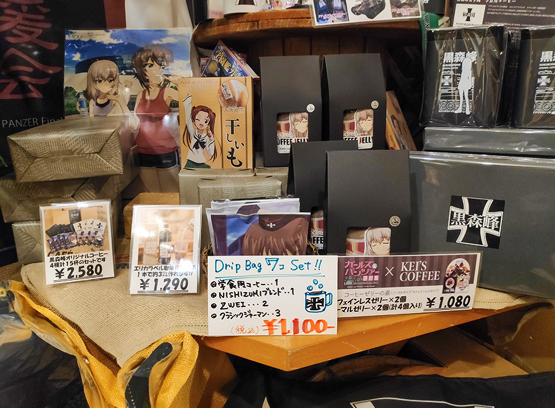 主に黒森峰女学園関連の珈琲やグッズを販売。黒森峰女学園はガルパンに登場する学校の一つで、所在地が熊本という設定になっています。ちなみに、現在のガルパン劇場版での黒森峰の隊長はエリカなので、今のガルパンコーナーはエリカ推しで構成してあるようです。