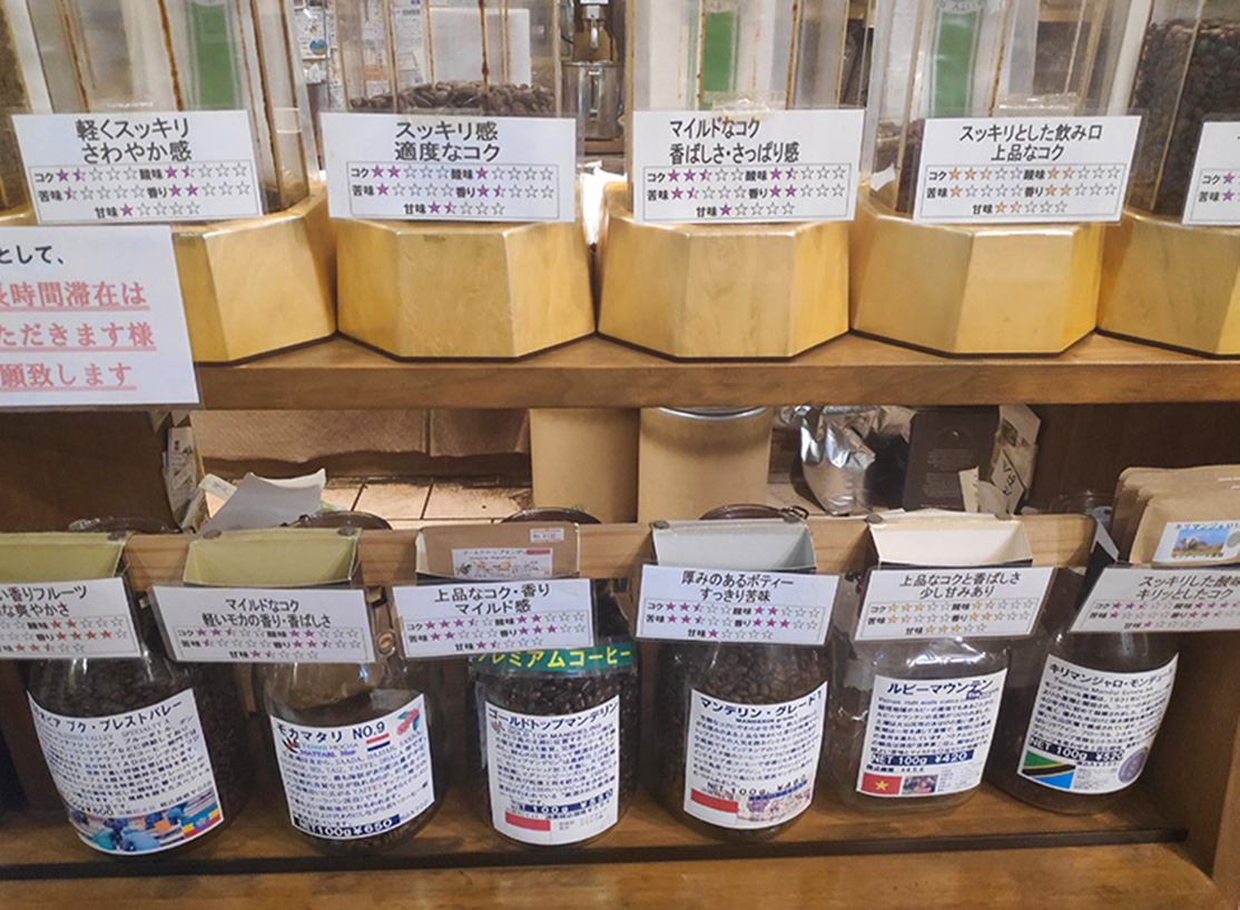 約50種類もの自家焙煎珈琲豆と約18種類の紅茶を取扱う専門店で、店内に入った瞬間、所狭しと並んでいる珈琲豆の香ばしい香りに心が癒されます。