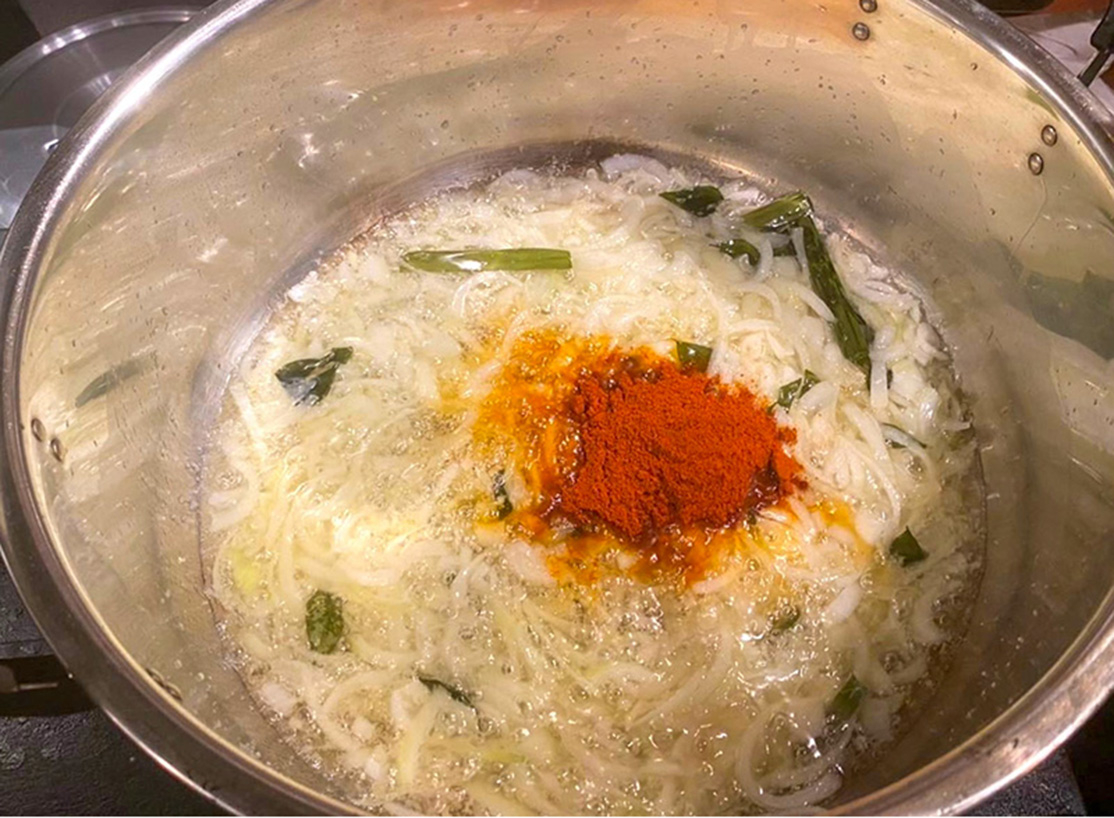 たっぷりの玉ねぎなど煮詰めてスパイス投入した後は、鶏肉を入れて煮込み、ココナッツミルクなどを加えて味を整えて完成。ターメリックライスの上のサラダは生野菜ではなく、レモン・鰹節・ブラックペッパーで味付けがしてありますので、カレーと混ぜて楽しんでください。