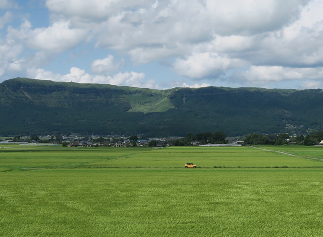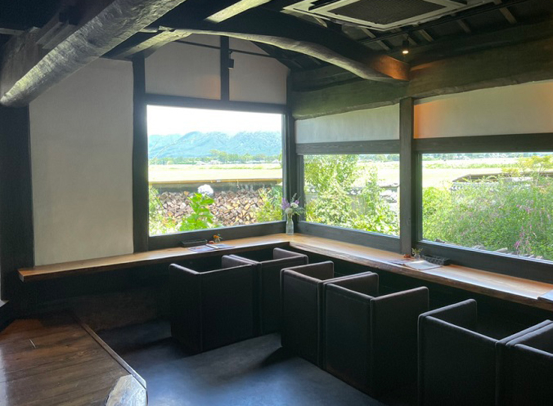 敷地が広いので、店舗の周囲には木々や草花がたくさんあり、田園風景と遠くには北外輪山、そのまた向こうには“くじゅう連山”も見える阿蘇ならではの絶景は圧巻。四季折々に変わるその風景は、なかなか街なかでは味わえない風情を感じることができます。