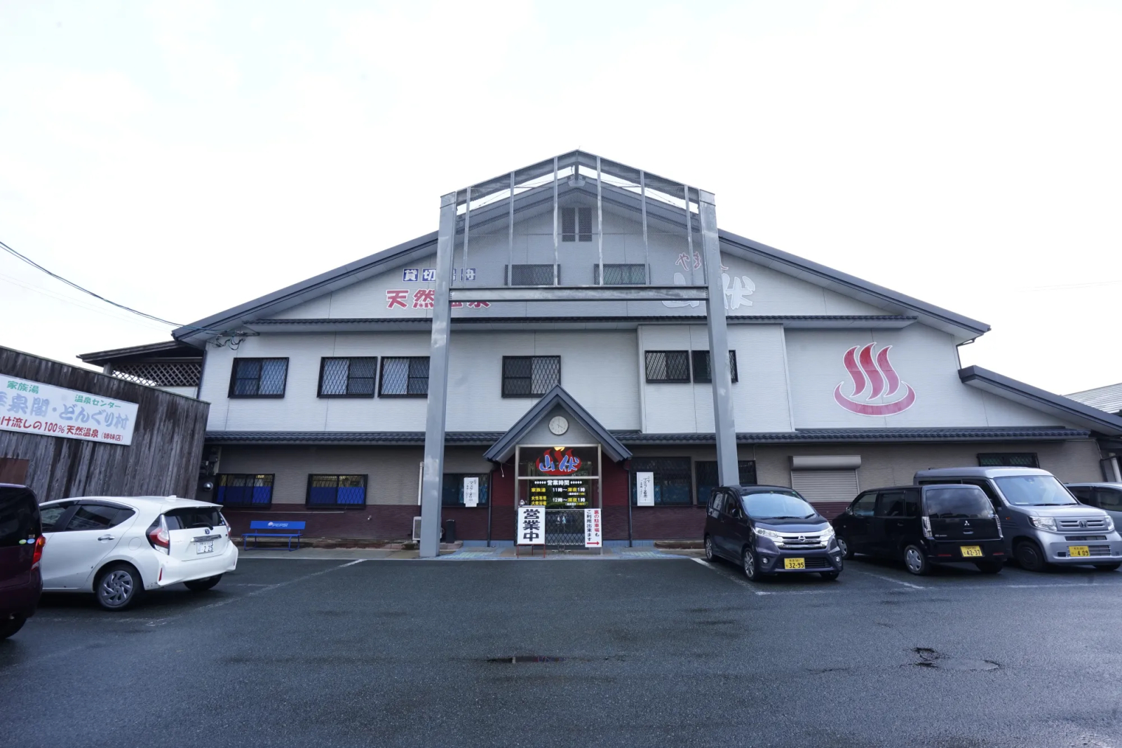 待合室(コロナで閉鎖中)、駐車場(車内)で待機可能、自販機、牛乳、無料の飲泉あり。