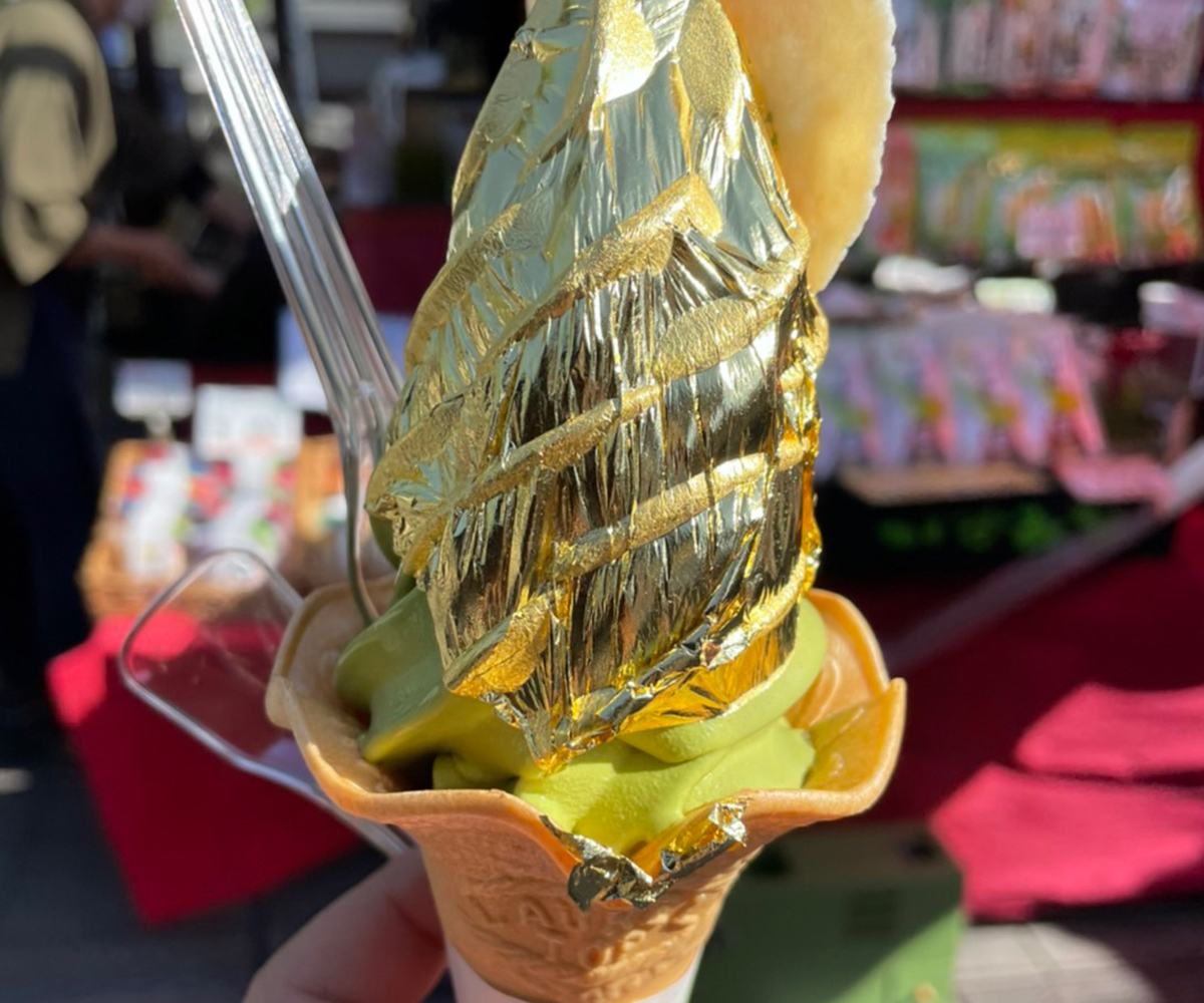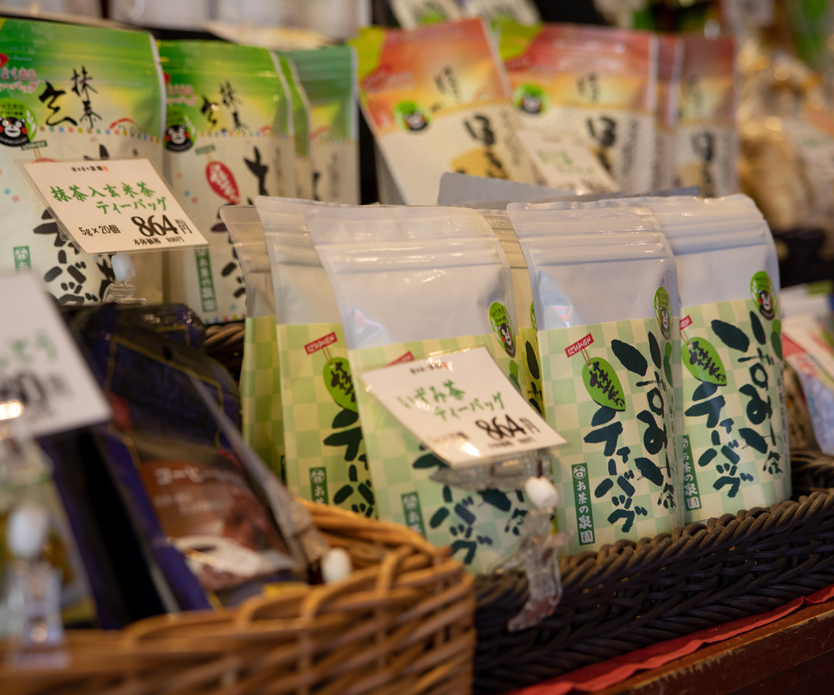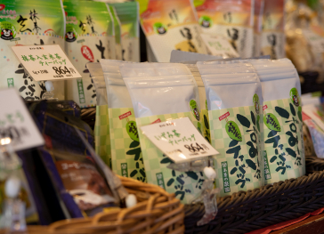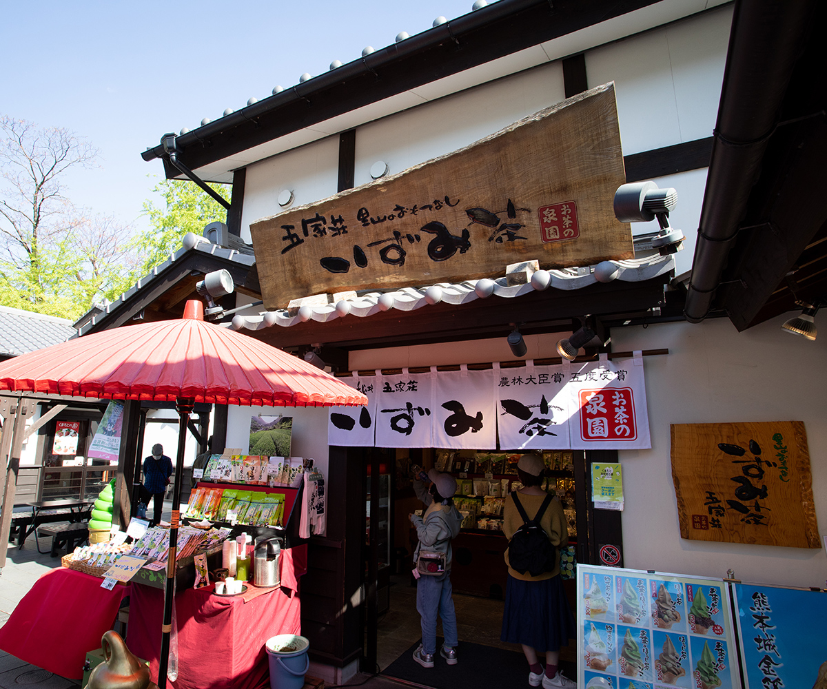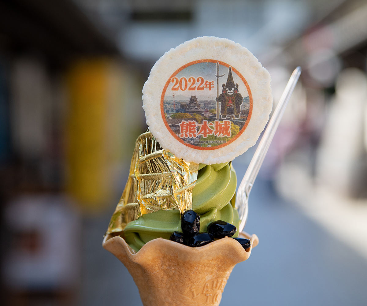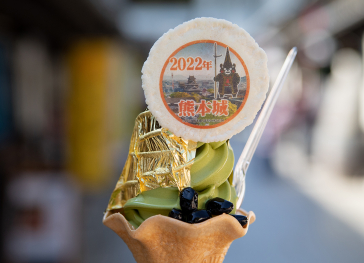 城彩園内にある「お茶の泉園」。園内にはいくつかソフトクリームがある中で特に目立つ熊本城金箔ソフト!大自然で育った抹茶をもとに作られたソフトクリームに、熊本城の昭君の間をイメージした金箔。店内では泉園のお茶やお茶の加工品の数々が揃う。